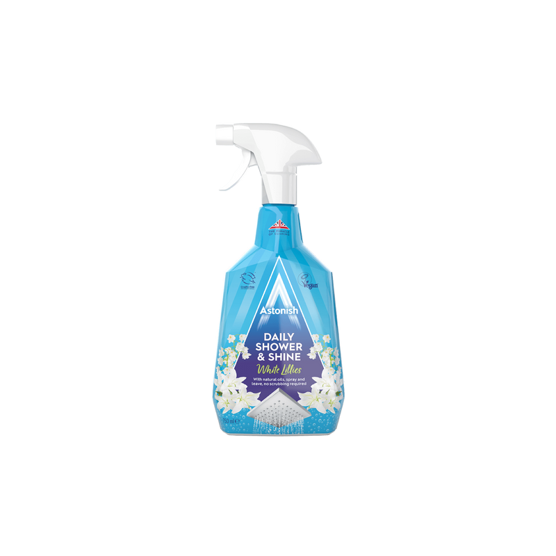 Astonish Daily Shower & Shine to produkt stworzony do zabezpieczenia powierzchni w łazience przed osadzaniem się zanieczyszczeń czy osadów z mydła, rdzy i kamienia. Podstawowym preparatem dostępnym w ofercie jest linia o zapachu białych lilii wzbogacona o naturalne olejki eteryczne. Pojemność 750 ml.