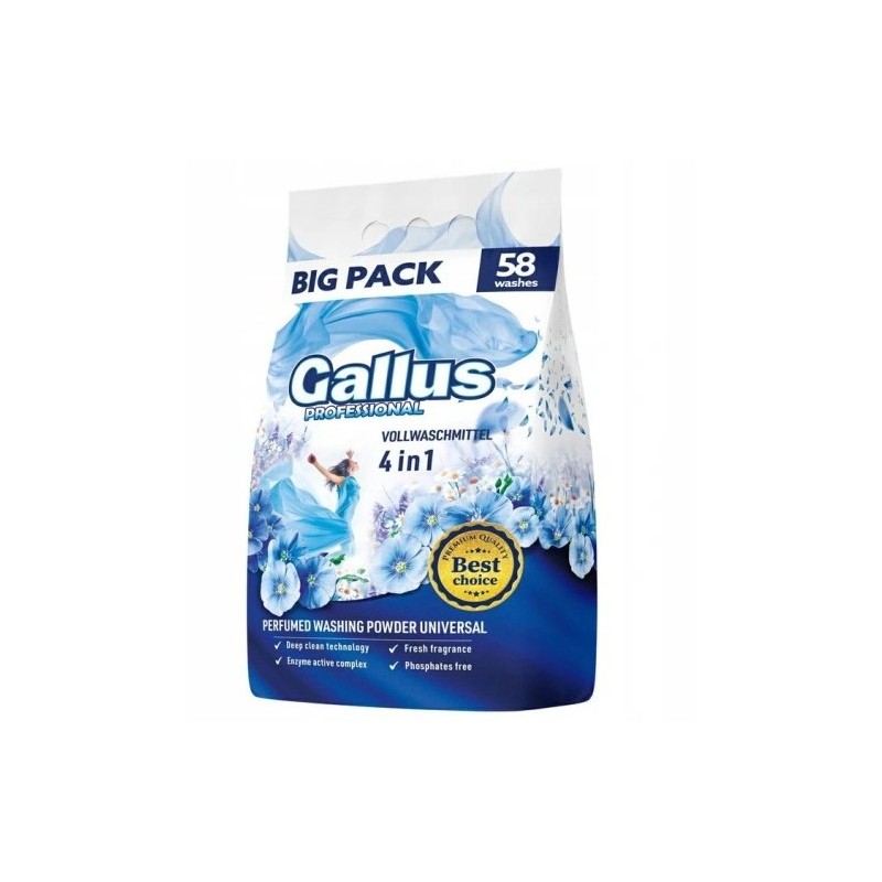 Proszek do prania 4w1 Gallus - Uniwersalny Innowacyjna formuła piorąca, wnikająca głęboko we włókna. Nadaje pranym tkaninom przyjemny, świeży zapach. Zawiera aktywne enzymy wspomagające i ułatwiające pranie. Nie zawiera fosforanów.